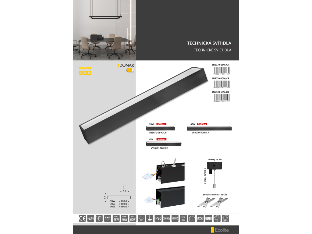 Modulární systém lineárního osvětlení DONAR přináší variabilitu do vaší kanceláře. Každý výrobek z řady je vyroben z litého hliníku a navržen tak, aby jej bylo možné vzájemně kombinovat a vytvářet tak vizuálně poutavé sestavy, které poskytnou dostatek světla. Díky mikroprizmatickému krytu a užšímu vyzařovacímu paprsku navíc šetří zrak. Všechny modely mají vlastní předřadník a lze je tak kreativně napojovat na další prvky pomocí konektorů, a to až do celkového výkonu 600W s použitím 1 přívodního kabelu. Každý rovný model funguje i samostatně a balení obsahuje montážní sady pro přisazení i zavěšení s možností regulace výšky.Pro mechanické spojení 2 rovných kusů slouží hliníková spojka LN5070-SPOJ/ALU. Veškeré svítící spojky LN5070-SPOJ/L-8W, LN5070-SPOJ/T-12W a LN5070-SPOJ/X-15W jsou vybaveny mechanickým i elektrickým konektorem a nedisponují vlastním přívodním kabelem.Doplňkové parametry