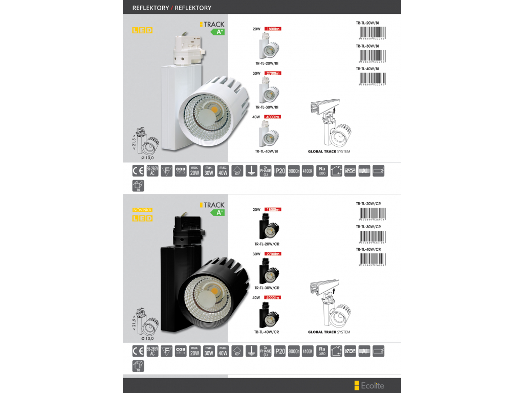 Designový LED reflektor TR-TL je třífázové svítidlo pro uchycení na lištový systém, který lze sestavit na míru podle dispozic a účelu místnosti. Výrobek nabízíme ve výkonech 20, 30 a 40W a díky modernímu LED COB čipu se postará o úsporný chod a stabilní výkon v řádu desítek tisíc hodin.Produkt je vhodný jako bodové osvětlení interiéru v domácnosti, ale najde široké uplatnění v obchodních prostorách při nasvícení určité umělecké scény, regálů či prodejních pultů.Lišty jsou samostatně prodejné položky, nejsou součástí dodávky.Doplňkové parametry