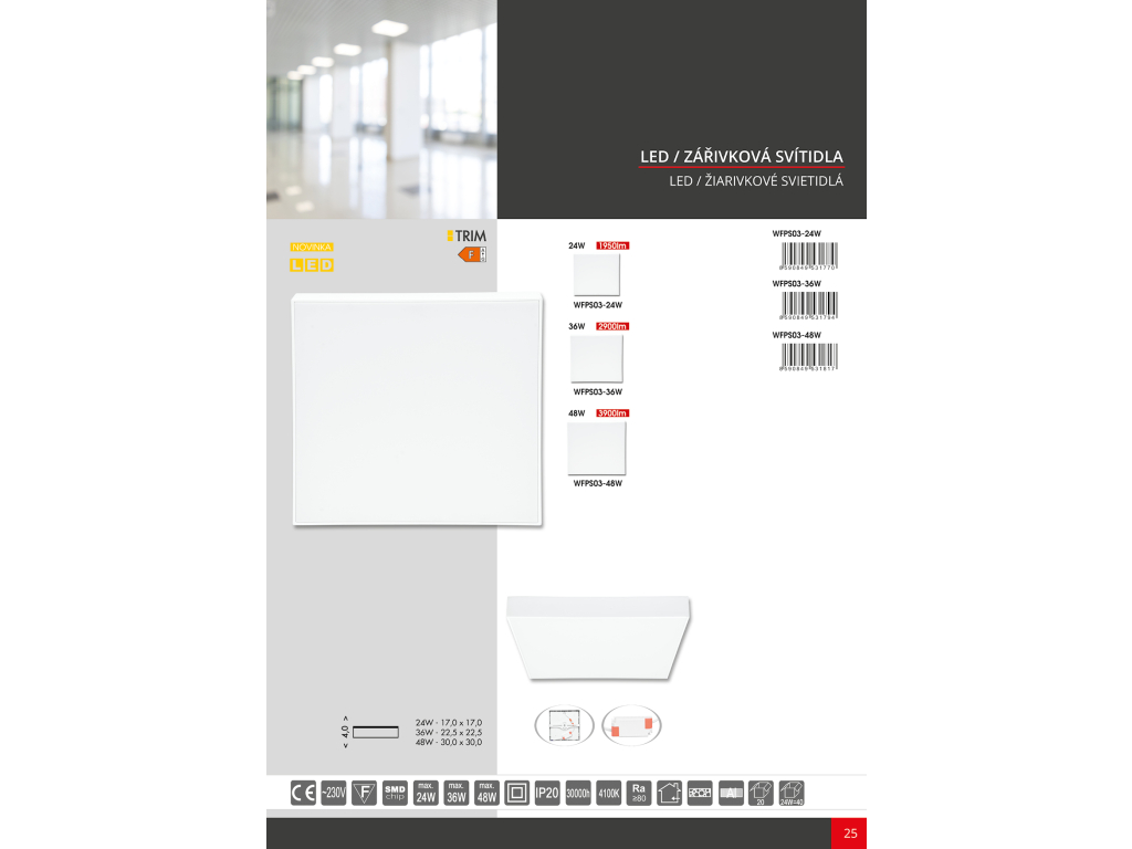 | Cena zahrnuje: | SMD sv. přisaz.30x30cm,48W,4100K,IP20,3900lm |