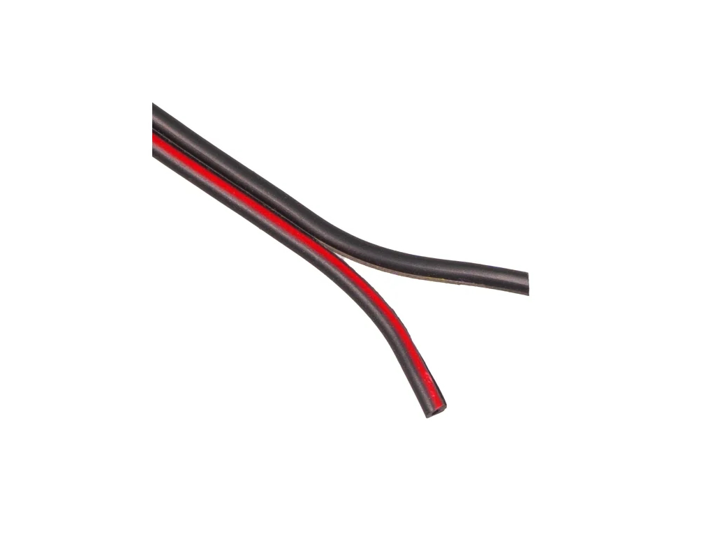 Dvoužilový plochý vodič s laněným měděným jádrem. Izolace je z černého PVC a jedna z žil je označena červeným pruhem.