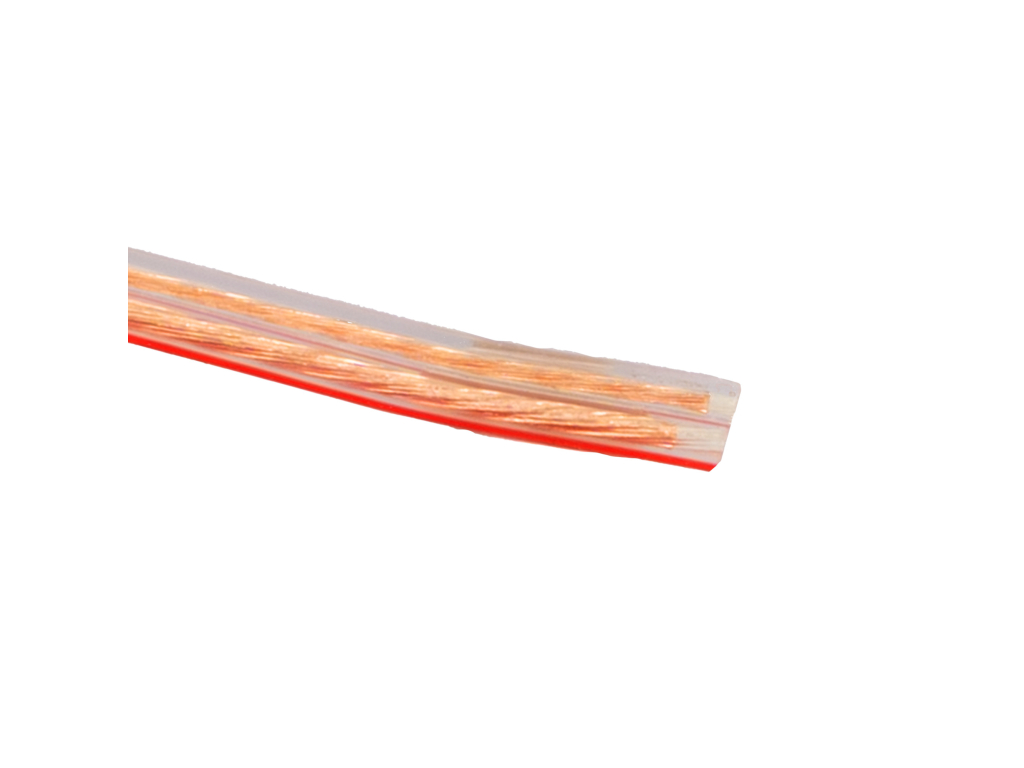 ||"Dvoužilový plochý vodič s laněným měděným jádrem. Izolace je z transparentního PVC a jedna z žil je označena červeným pruhem.