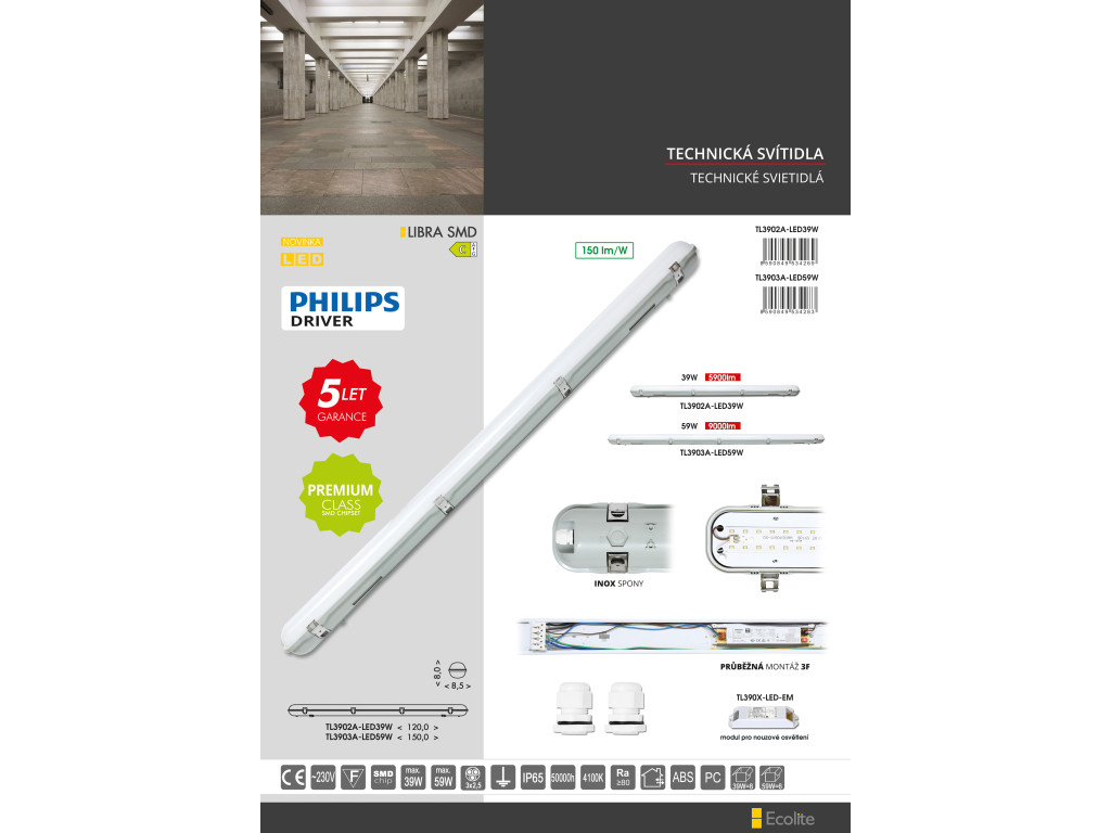 Prachotěsné průmyslové LED svítidlo LIBRA SMD je plnohodnotná náhrada za zářivkové prachotěsy. Využívá vysoce úspornou technogii SMD (čip 2835), vynikající předřadník značky Philips a vyznačuje se vysokou odolností proti prachu a vlhkosti IP65. Je tak vhodné například do výrobních, hal, skladů, ale i k venkovnímu použítí. Tento vylepšený model je vybaven nerezovými sponami a umožňuje průběžnou montáž 3F. Životnost LED zdroje je zhruba 30 000 hodin.Doplňkové parametry