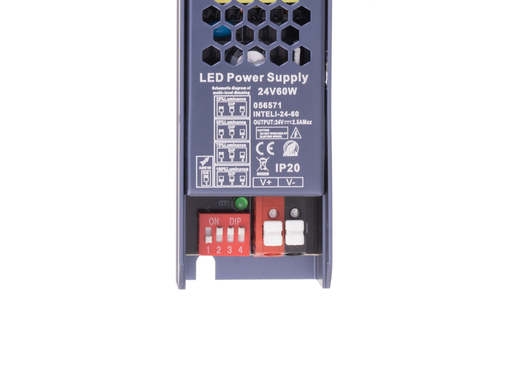 Vnitřní elektronický spínaný zdroj pro LED řady INTELI v krytí IP20, který je vhodný pro LED osvětlení jako jsou LED pásky, LED žárovky a jiné 24V DC LED osvětlení. Oproti klasickým zdrojům má řada INTELI tyto unikátní vlastnosti, které lze nastavit na výstup zdroje: