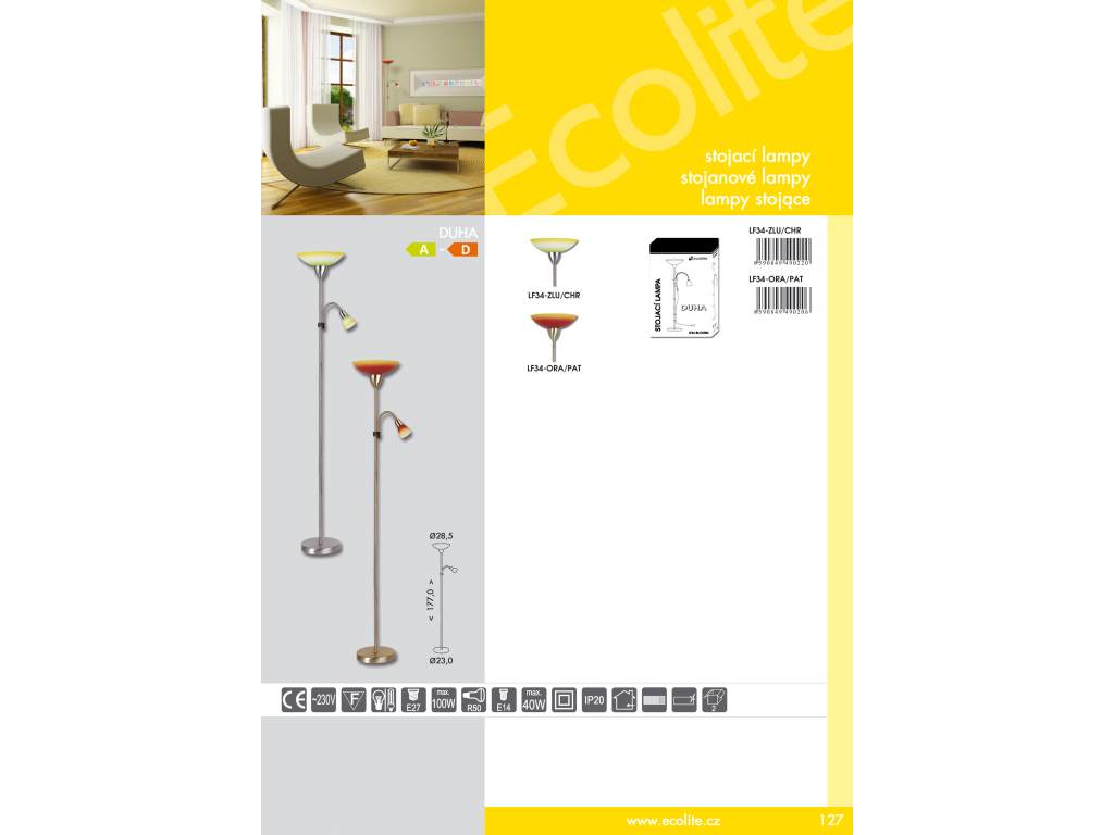 Moderní stojací lampa DUHA je vhodná pro osvětlení interiérů: obývacích a dětských pokojů, ložnic a kanceláří. Konstrukce se vyznačuje 2 rameny s přímým bodovým (max 40W) i nepřímým osvětlením směrem ke stropu (max 100W). Krk bodového světla je ohebný a umožňuje pohodlné nastavení směru světelného toku.Využívá klasickou patici E27 (hlavní světlo) a E14 (bodové), takže lze osadit kompaktní úspornou zářivkou i LED žárovkou. Celý produkt je vyroben z kovu a skla. Zdroj není součástí dodávky.Kategorie produktu